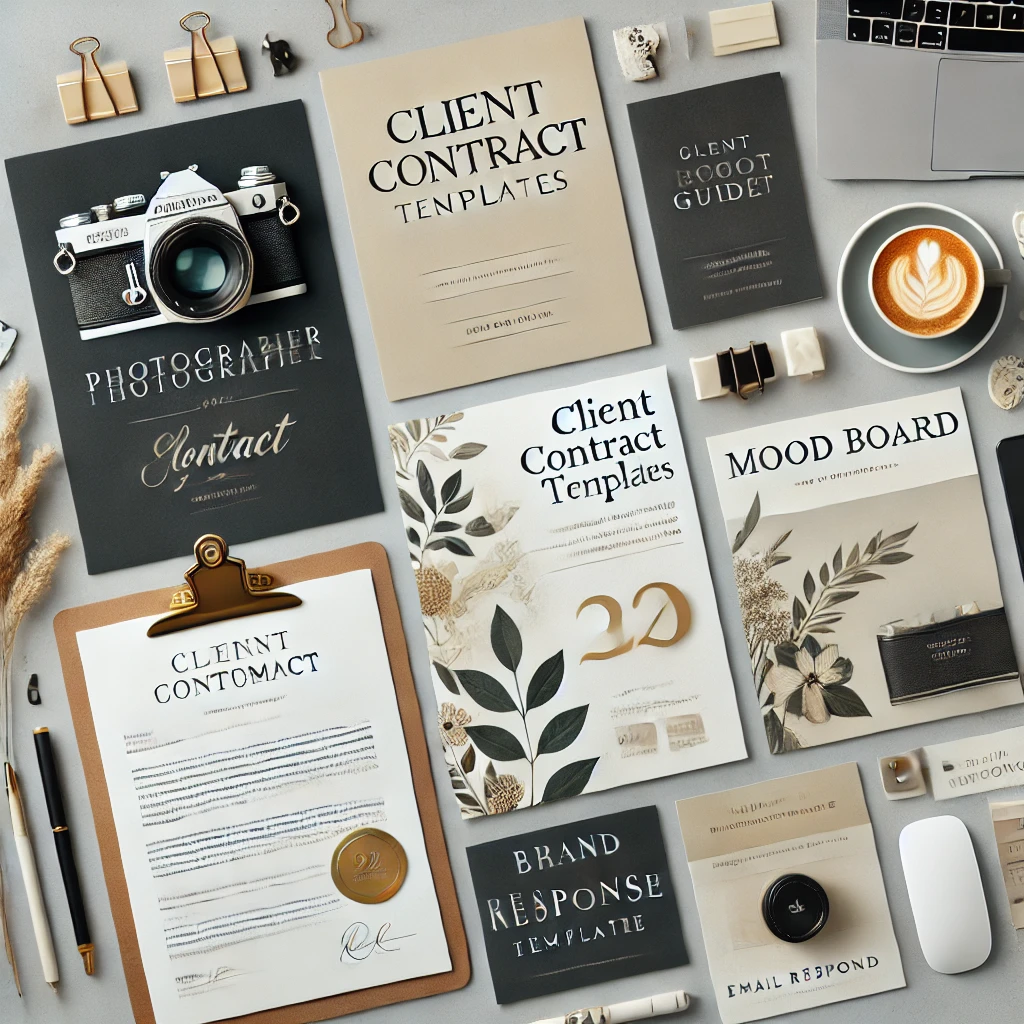 A comprehensive bundle with editable templates for pricing guides, client contracts, branding boards, and email responses.